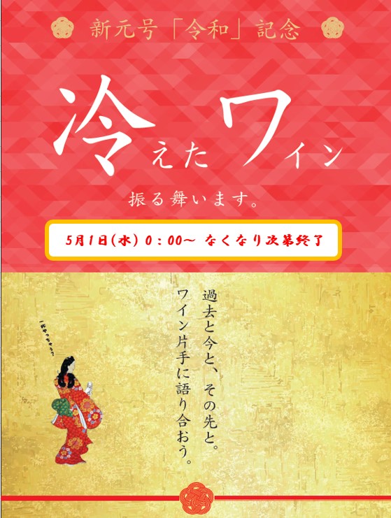 安心お宿、「令和」になる瞬間に 『冷えたワイン』=『令ワ』無料提供!5/1数量限定 〜「平・成・令・和」の漢字使用のお名前の方に宿泊無料など特典も〜