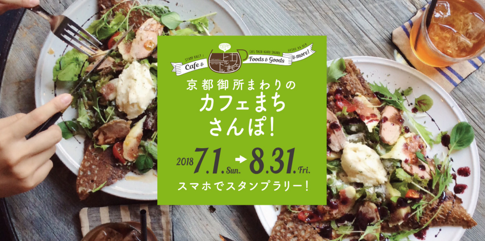 京都御所まわりのカフェ 29 店舗がつながり、 スマートフォンを活用した新たな形のラリーで回遊性を高め、 来街客の少ない夏場の賑わい創出を図ります!