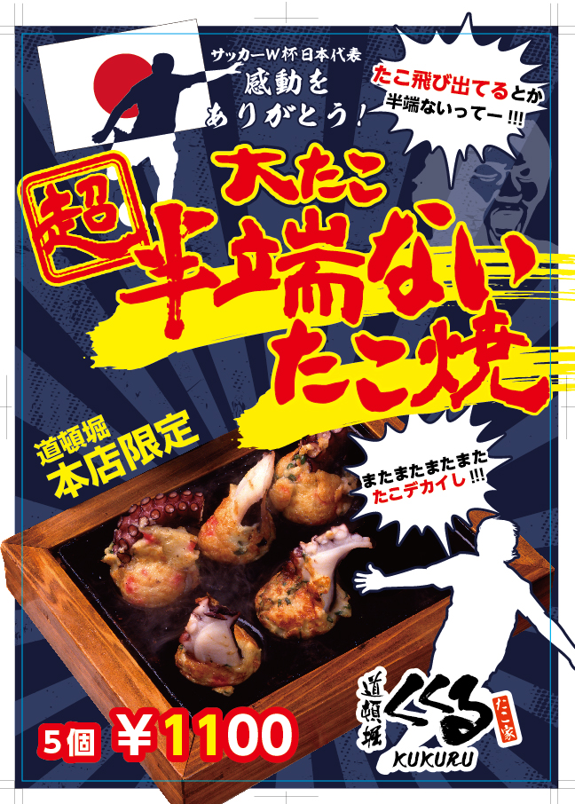 サッカーW杯日本代表 感動をありがとう!! 日本の大健闘を記念して ぷりっぷりの大たこがはみ出る [大たこ“超”半端ないたこ焼]が特別販売決定!