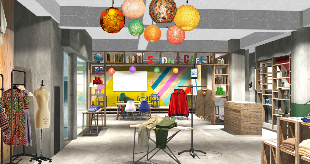 スピンズ新業態!古着屋×カフェ「SPINNS VINTAGE&CAFÉ」 4/14(土)スピンズ・アメリカ村店2階にオープン 「リサイクル」の先を行く「アップサイクル」店舗へ 店内にミシンを設置!持ち込んだ古着をカフェで使用するコースターやエプロンに