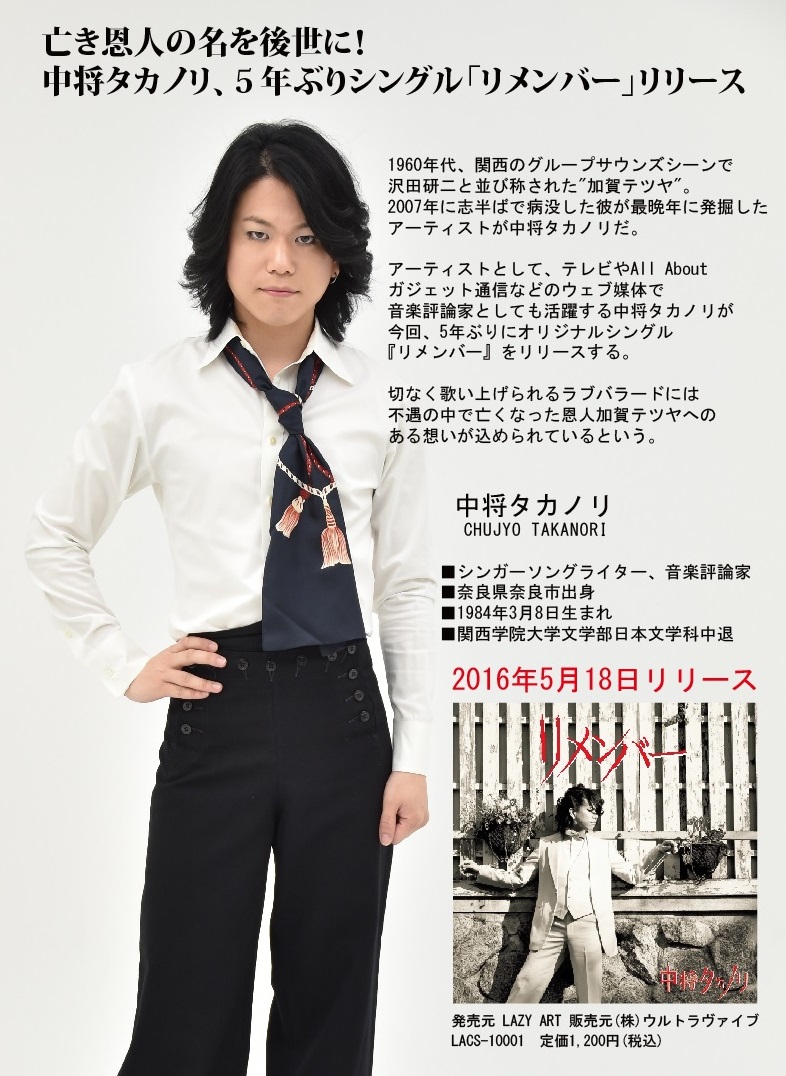 亡き恩人の名を後世に!中将タカノリ、5年ぶりシングル「リメンバー」リリース