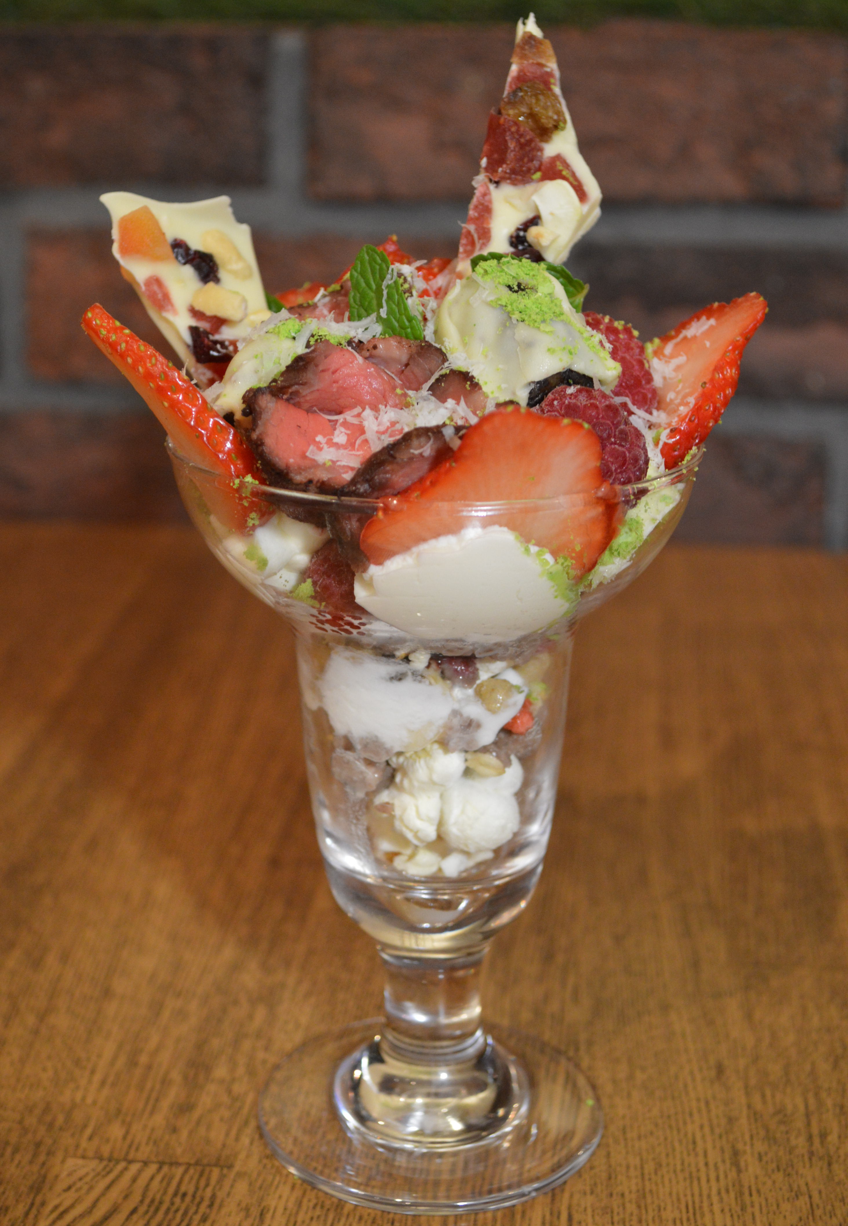 大好評につき「チョコ×肉」パフェシリーズ第2弾 今回はホワイトデーに合わせてホワイトチョコ使用 ~ミンチ肉や牛肉をホワイトチョコでコーティング~