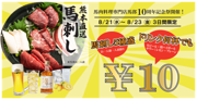 熊本直送本格馬刺し盛合わせ10円!生ビール10円! ~京橋隣の蒲生4丁目にある馬肉料理専門店馬郎 お得な10周年感謝祭を8月21日~23日の3日間開催~