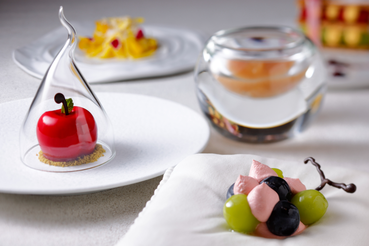 ホテルパティシエの作り立てデザートをコース仕立てで。 Iro-casane Dessert Course期間限定でご提供 桃、葡萄など、季節のフルーツをご堪能いただけます。 2021年7月22日~8月29日