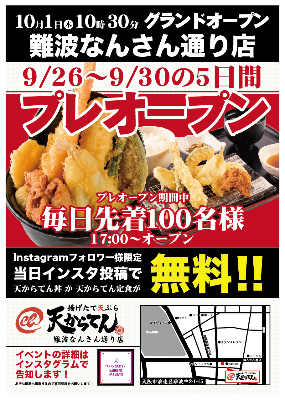 3号店目 難波なんさん通り店、10/1グランドオープン! 9/26~9/30までの5日間。天からてん自慢の天からてん丼&天からてん定食がInstagram投稿で毎日先着100名様無料!