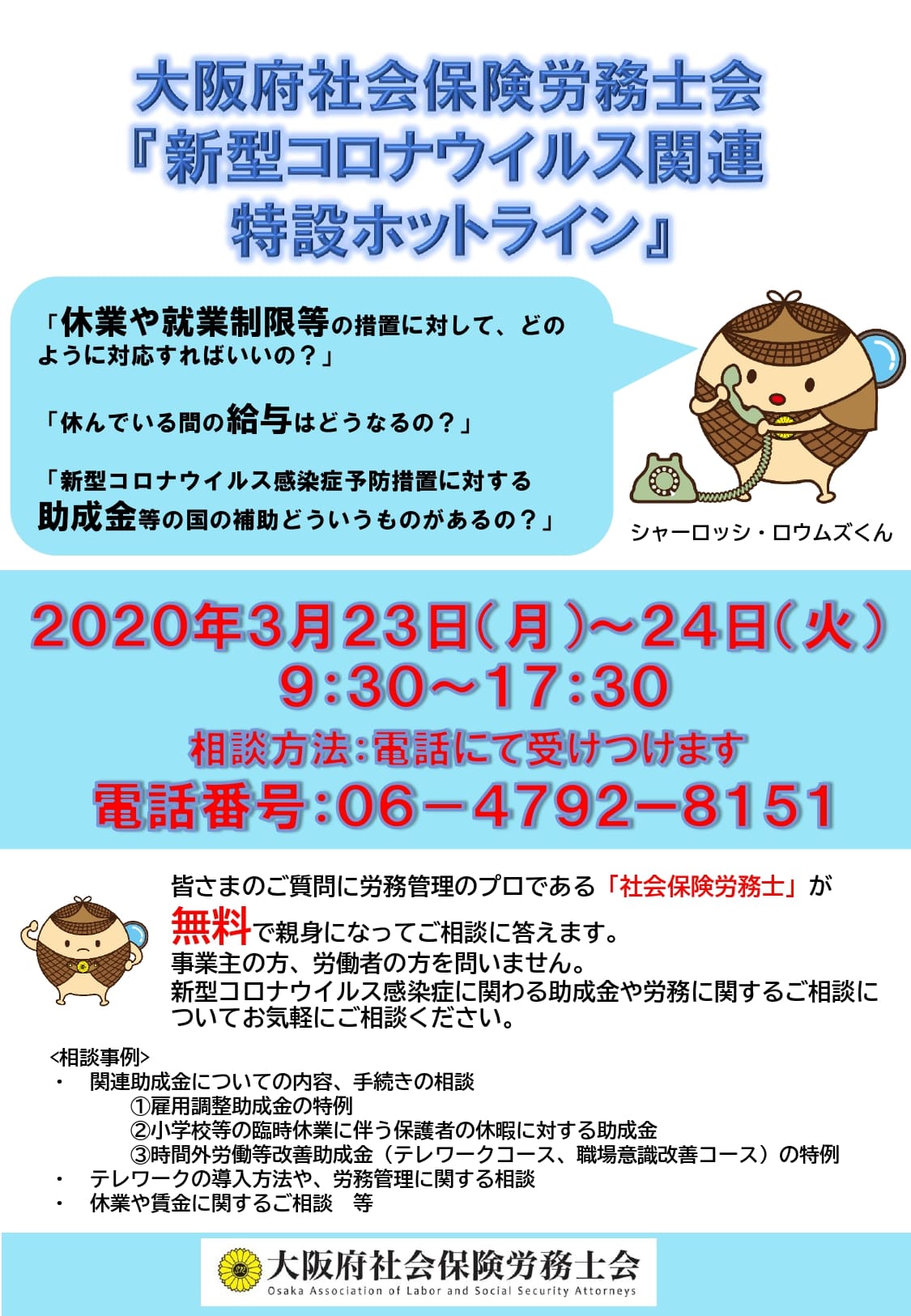 大阪府社会保険労務士会 『新型コロナウイルス関連特設ホットライン』を開設