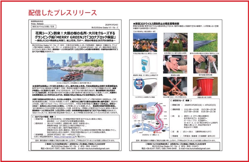 花見シーズン到来!大阪の桜の名所・大川をクルーズする グランピング船「MERRY GREEN」で「コロナブロック保証」 ~徹底したコロナ感染防止対策で、船上花見。万が一、感染の場合は28万円の謝罪金~