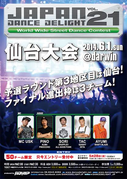 日本最大のストリートダンスコンテスト「JAPAN DANCE DELIGHT(ジャパンダンスディライト)」を運営する株式会社アドヒップ(大阪府大阪市西区北堀江1丁目19−1八光心斎橋AIRビル6F)は、2014年6月1日(日)14時より、仙台darwin(宮城県仙台市青葉区一番町3-9-13 DATE ONEビルB1F)にて、同コンテストの仙台地区予選大会を開催致します。