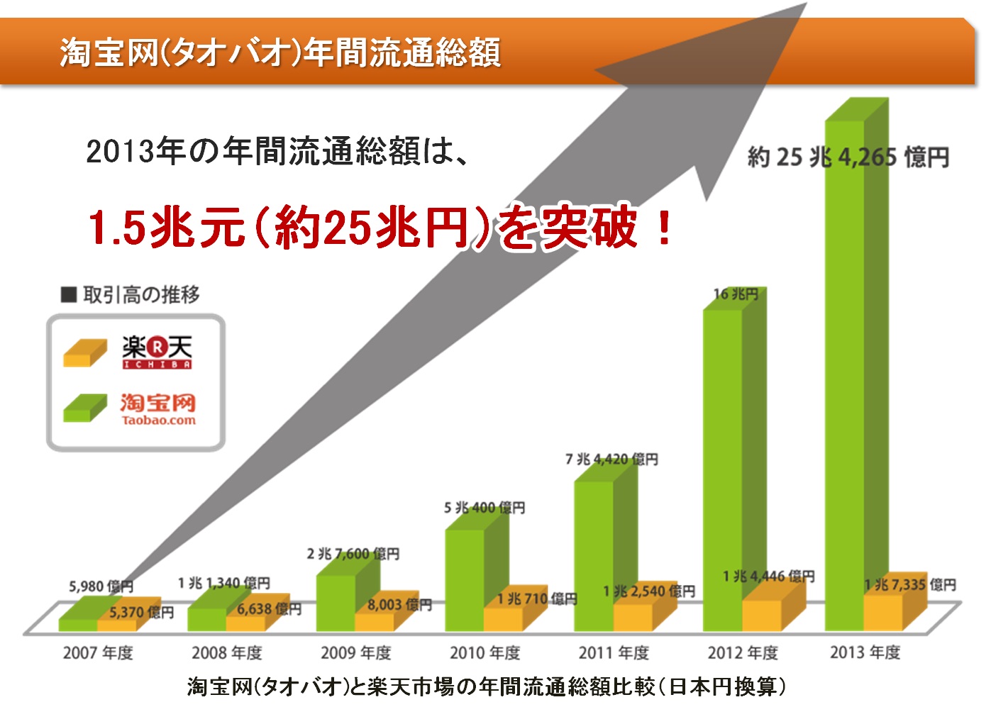 世界最大のE コマース企業「アリババグループ」が運営する、ネットショッピングモール「タオバオ」は、会員数が5 億人以上、年間売上高が1.5 兆元(約25 兆円)と世界最大で、楽天市場の約15 倍もの売上があります。