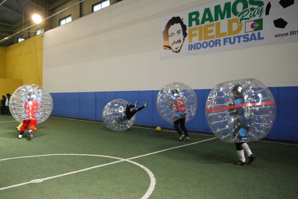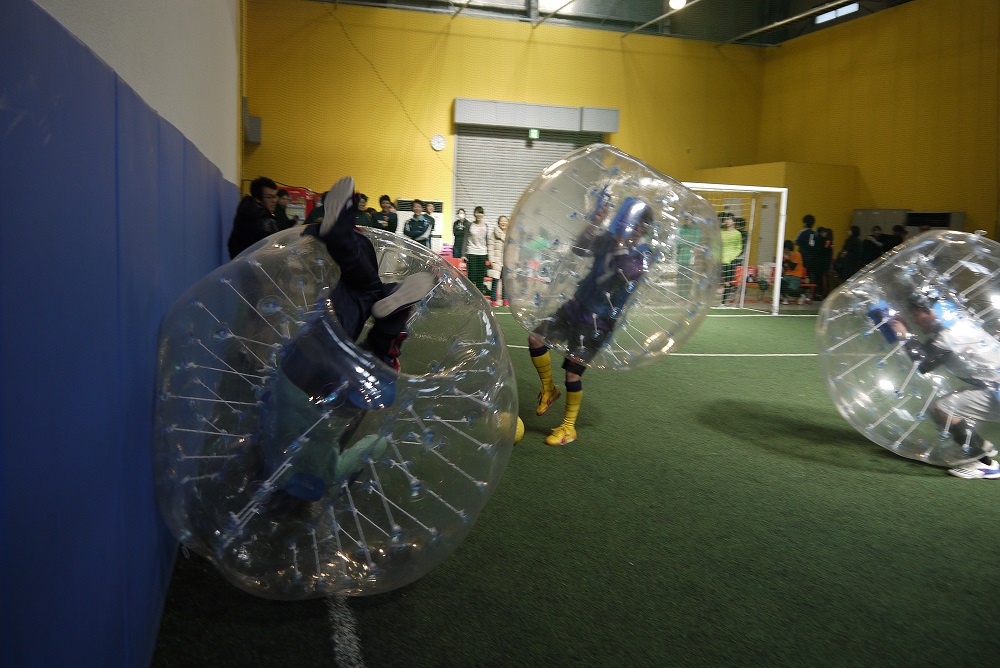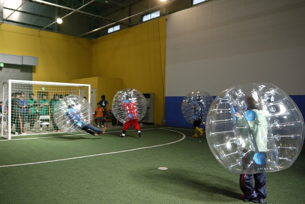 バブルサッカーは各人が直径1.5メートルほどのビニルボールに包まってフットサルをするスポーツです。