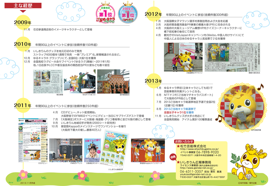 いしきりん・・・・2013年から松竹芸能に所属しており、2013ご当地キャラ総選挙で近畿地区1位、全国女子キャラ1位を獲得。大阪府親善大使も務め、大阪のPRも行っております。(主な経歴資料別添)