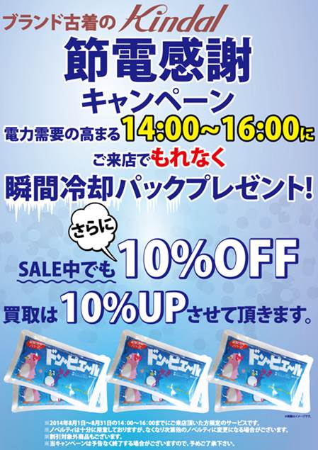 ブランド古着のユーズドセレクトショップ、株式会社Kindal(滋賀県大津市本堅田6-6-37:代表田中安隆)は、夏の節電対策の一環として東京・愛知・大阪など全国にある全27店舗で、2014年8月1日~8月31日の14時~16時に来店したお客様に瞬間冷却パックを配る「節電感謝キャンペーン」を実施致します。