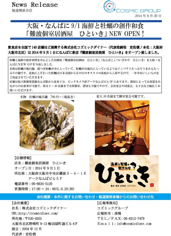 飲食店を全国で140店舗ほど展開する株式会社コズミックダイナー(代表取締役 定松慎/本社:大阪府大阪市北区)は2014年9月1日になんばに新店『難波個室居酒屋 ひといき』をオープン致しました。