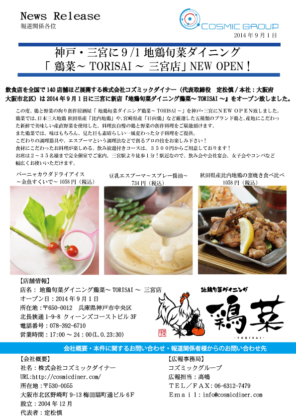飲食店を全国で140店舗ほど展開する株式会社コズミックダイナー(代表取締役 定松慎/本社:大阪府大阪市北区)は2014年9月1日に三宮に新店『地鶏旬菜ダイニング鶏菜~TORISAI~』をオープン致しました。