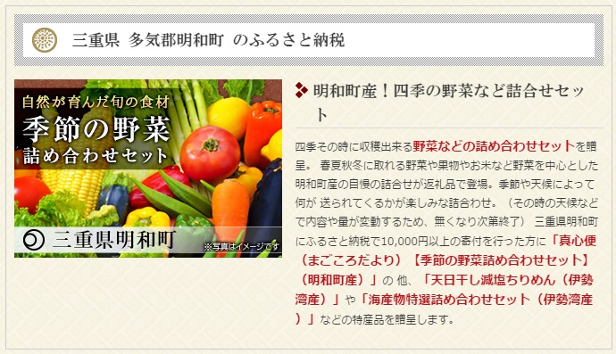 三重県明和町では春夏秋冬に取れる野菜や果物やお米など野菜を中心とした明和町産の自慢の詰合せが返礼品で登場。季節や天候によって何が送られてくるかが楽しみな詰合わせ(その時の天候などで内容や量が変動するため、無くなり次第終了)。三重県明和町にふるさと納税で10,000円以上の寄付を行った方に「真心便(まごころだより)【季節の野菜詰め合わせセット】(明和町産)」の 他、「天日干し減塩ちりめん(伊勢湾産)」や「海産物特選詰め合わせセット(伊勢湾産)」などの特産品を贈呈している。
