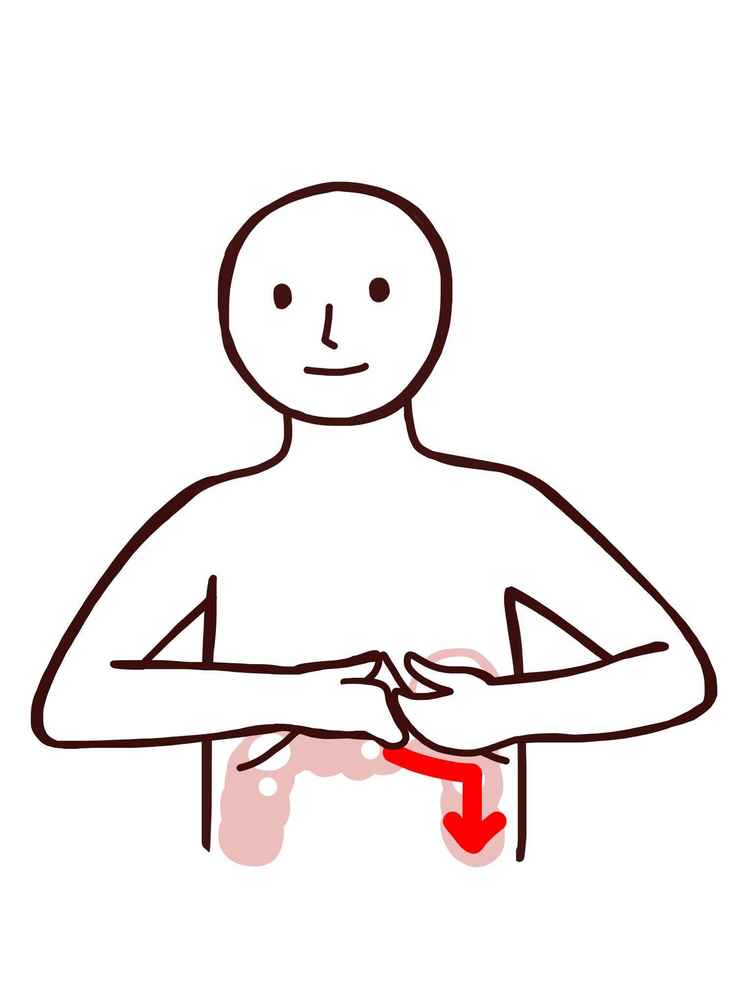 腸に溜まったガスはオナラやゲップとして体外に出る以外にも、腸から血管の血中に溶け込んで肺から放出するので、ガスの溜まった腸の部分を手で刺激して血中にガスを溶け込ませてゆきます。