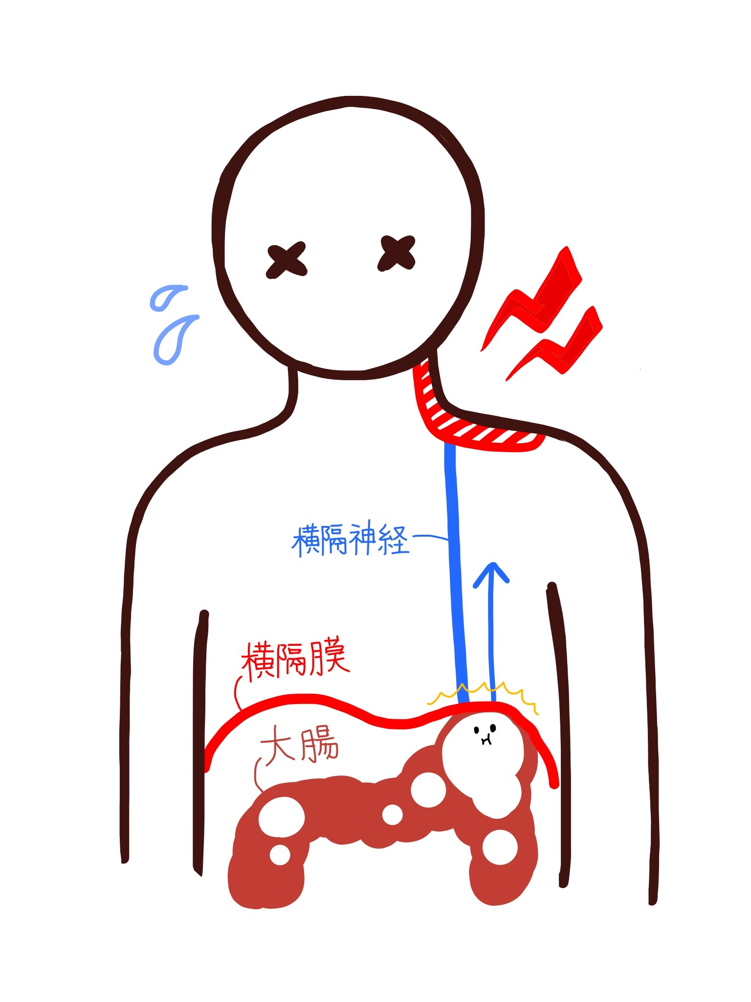 ガスは軽いので腹部の上方へ上がり大腸の曲がり角に集まりやすい為、溜まったガスは横隔膜を押し上げ横隔神経を伝い、痛いほどの肩コリや首のコリまで発生させてしまいます(※とくに左の首肩)。