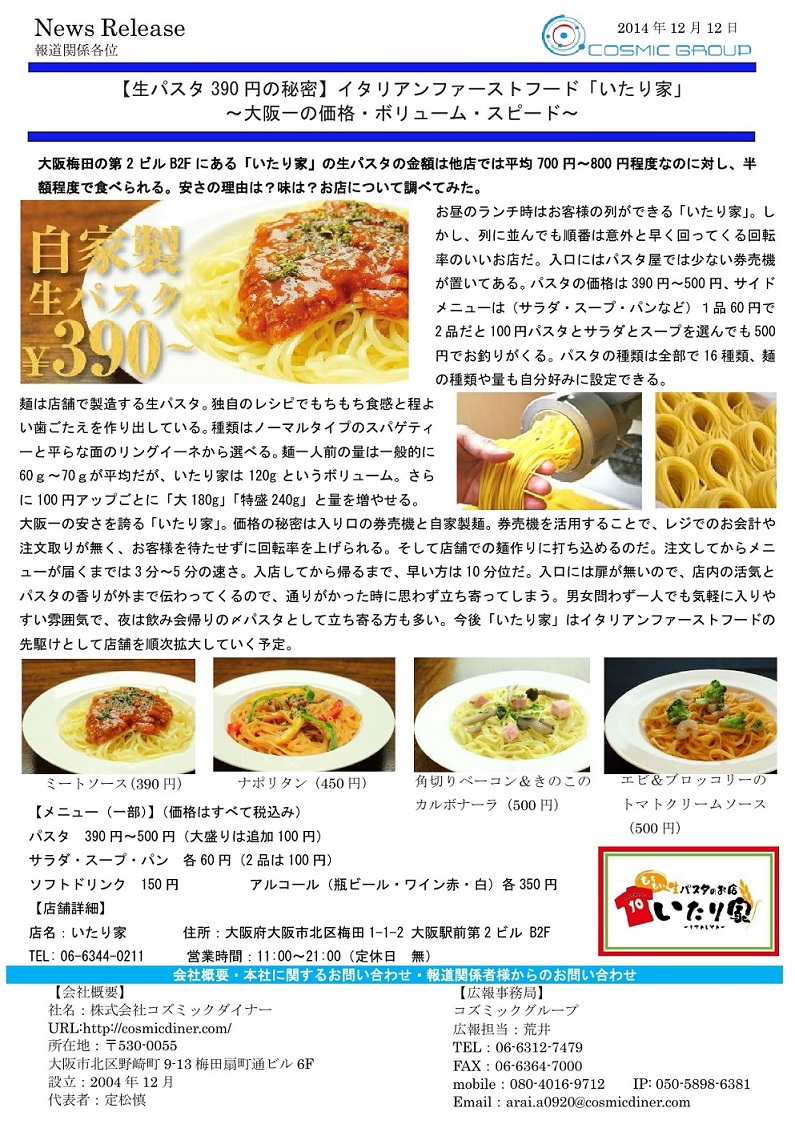 大阪一の安さを誇る「いたり家」。価格の秘密は入り口の券売機と自家製麺。券売機を活用することで、レジでのお会計や注文取りが無く、お客様を待たせずに回転率を上げられる。そして店舗での麺作りに打ち込めるのだ。注文してからメニューが届くまでは3分~5分の速さ。入店してから帰るまで、早い方は10分位だ。入口には扉が無いので、店内の活気とパスタの香りが外まで伝わってくるので、通りがかった時に思わず立ち寄ってしまう。男女問わず一人でも気軽に入りやすい雰囲気で、夜は飲み会帰りの〆パスタとして立ち寄る方も多い。今後「いたり家」はイタリアンファーストフードの先駆けとして店舗を順次拡大していく予定。