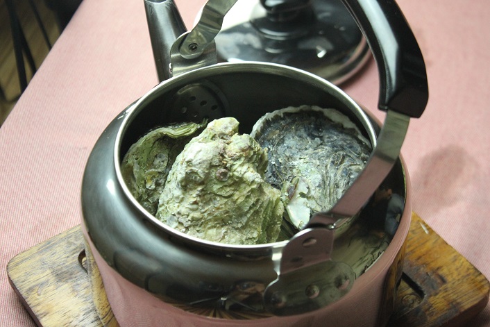 やかんの中にぎっしり詰まった直送牡蠣をコンロで6分加熱し、3分蒸したら出来上がり!加熱されたやかんの中で牡蠣の身が膨らみ、牡蠣の香りが店内に広がる。出来上がった牡蠣を軍手で掴み、牡蠣開けナイフでこじ開けながら食べるのが楽しく、産地の牡蠣小屋で食べた気分になる。