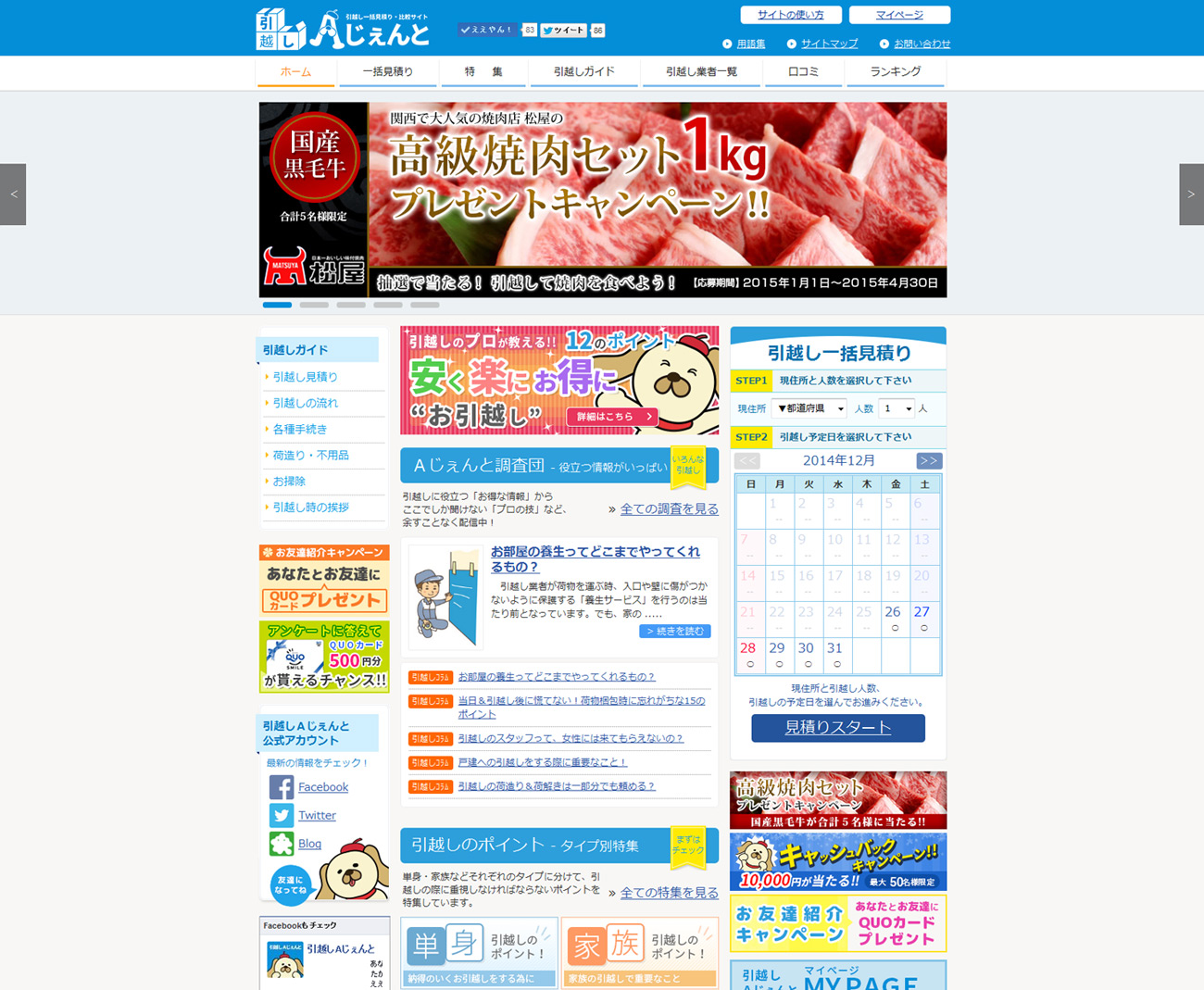 引越し一括見積り・比較サイト「引越しAじぇんと」では現金10,000円キャッシュバックや500円分のQUOカード、高級焼肉など総額100万円分の賞品をプレゼントするキャンペーンを実施中。