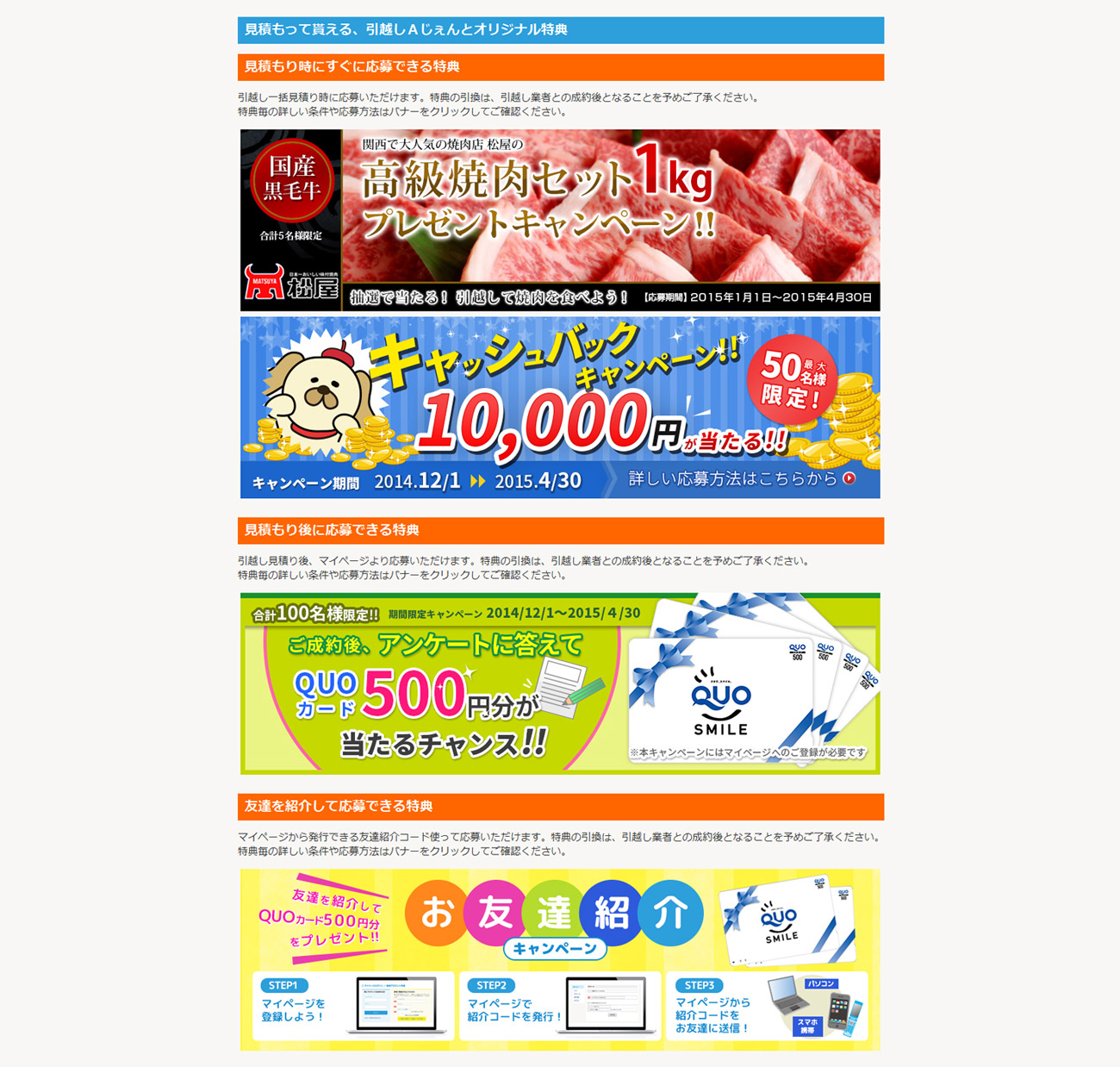・お友達を紹介&お友達が見積り~引越しであなたとお友達の双方に500円分のQUOカードをもれなくプレゼント!