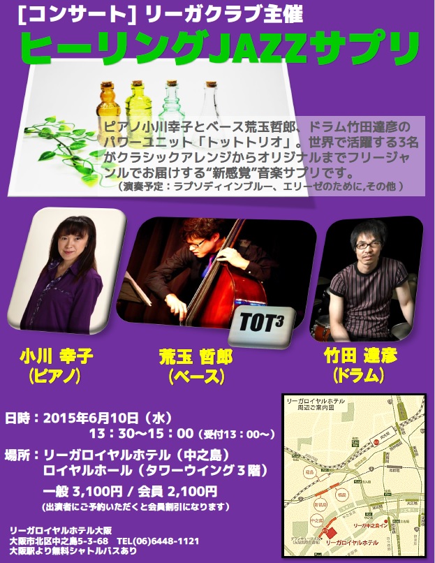 6月10日(水)13時30分から、リーガロイヤルホテル(中之島)ロイヤルホールにてリーガクラブ主催による「ヒーリングJAZZサプリ」コンサートを開催します。
