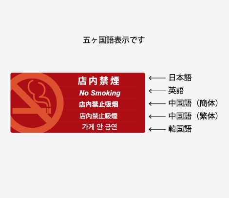 飲食店やお土産物屋さんで便利な外国人観光客の案内用の五ヶ国語(日、英、中(簡、繁)、韓)に翻訳済みのステッカー。