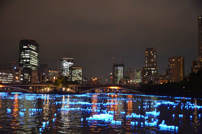 青く幻想的に煌めいてまさに“天の川”となった大川に揺蕩いながら、大阪城や天神橋・天満橋といった橋のライトアップ、市街地の夜景、たくさんの人々のにぎわいを体験し、あらためて水の都・大阪の夜の魅力を身近にお感じいただけるものと存じます。