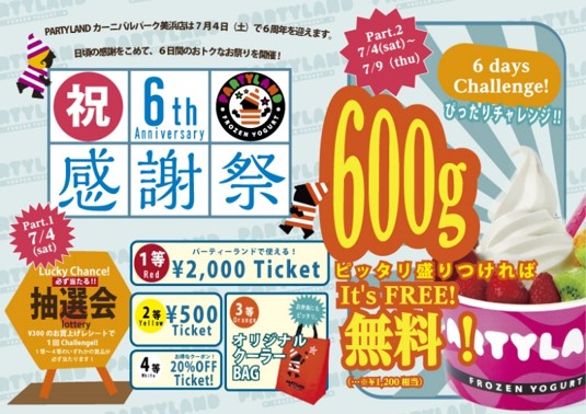 セルフスタイルのフローズンヨーグルト専門店パーティーランドを運営する株式会社イデア(本社:大阪府吹田市、代表取締役社長淀井三智)は、2015年7月4日(土)パーティーランド・カーニバルパーク美浜店がオープン6周年を迎えるのを記念して、6日間に渡って記念イベントを開催いたします。