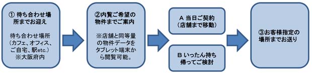 従来、様々な物件を取り扱う賃貸仲介という特性上、当社では店舗で物件選定後に内覧物件までのご案内を対応してきましたが、これを大阪府全域に拡大し、ご自宅、勤務先、喫茶店、公園等、場所を問わずお客様のご希望の場所までお迎えにあがります。店舗で紹介するのと同等量の物件データを入れたタブレットを準備し、お客様のご希望の場所で店舗と同等の物件紹介を行い、内覧を希望された場合は同地から物件までご案内いたします。
