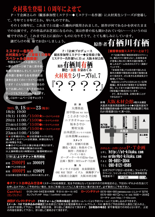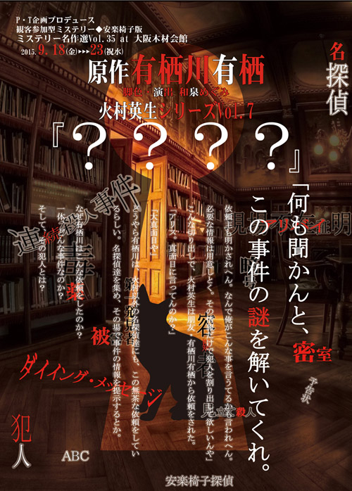 大阪を中心に活動するOffice P・T企画(代表和泉めぐみ)が2015年9月18日(金)〜23日(祝水)に大阪木材会館・会議室(大阪・西長堀)で大阪在住のミステリ作家・有栖川有栖氏の作品を舞台化した観客参加型ミステリー火村英生シリーズVol.7「????」を推理小説を体験するかのように原作の世界観そのままに上演します。