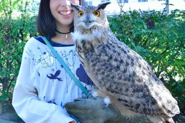 オーナーの愛梟、モンタ君(ユーラシアワシミミズク)は、初めての方でも抱っこしたり、腕に乗せて散歩したりできます。