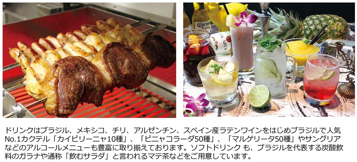 新業態のシュラスコ料理専門店「GRILL churrascoLATIN BAR 茶屋町」では、希少価値の高い牛肉の部位や鶏肉、豚肉、ソーセージ、グリル野菜をはじめ、シュラスコ店では珍しい黒毛和牛や、海老などの海鮮を鉄串に刺して焼き上げ、ギャルソン(ウェイター)が串ごとお客様のテーブルへ運びダイナミックに目の前で切り分けてお好きなだけ召し上がっていただくスタイルが特徴です。
