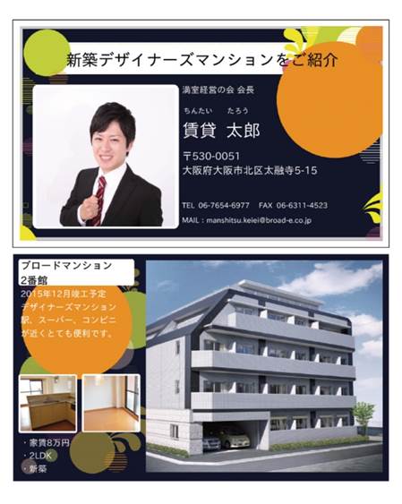 物件や家主様の顔など写真入りで両面刷りの名刺デザインを簡単に作成する事ができます。