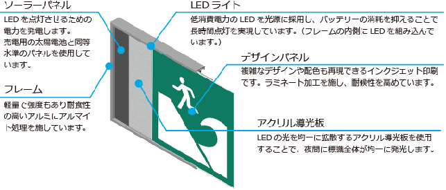LED標識・サインに太陽電池を内蔵した唯一の構造を採用しています。当社が特許および実用新案を取得したオリジナル構造です。