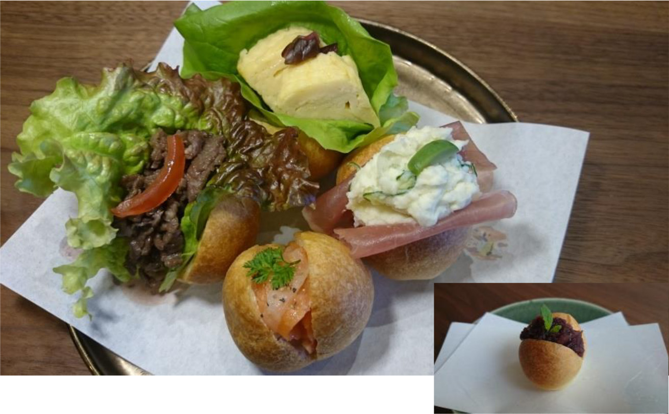 和牛の甘辛煮・京地卵のだし巻きしば漬け添え・サーモンマリネのクリームチーズ
