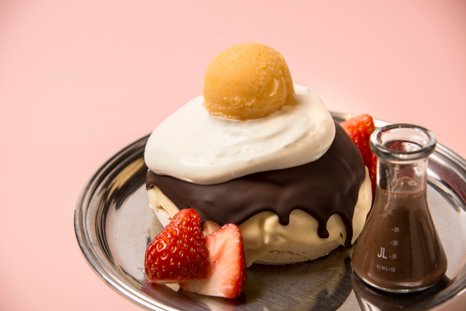 イースターエッグをイメージし、メレンゲを低温で焼き上げたサクサクした生地の上にホワイト チョコやダークチョコをコーティング。その上から生クリームやパッションマンゴーシャーベットを上に乗せた、見た目も楽しいスイーツ。シャーベットの甘酸っぱさがチョコレートとメレンゲの甘さを引き立たせます。さくさくの焼きメレンゲとコーティングされたパリパリのチョコレート、すっきりとしたシャーベットの食感のコントラストをお楽しみください。