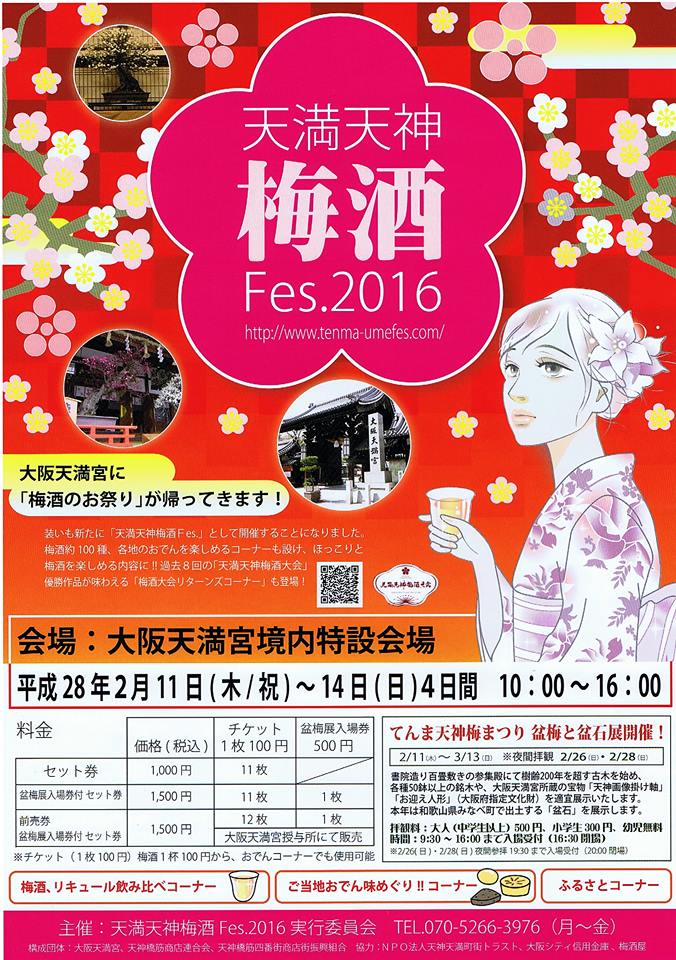 大阪天満宮恒例の「てんま天神梅まつり 盆梅と盆石展」(2/1~3/13)の幕開けを飾る「天満天神梅酒Fes.2016」を開催いたします。これは過去8回、開催を重ねてまいりました「天満天神梅酒大会」を装いも新たに開催するものです。梅酒約100種が楽しめることに加え、各地のおでんを楽しめるコーナーも設け、ほっこりと梅酒を楽しめる内容となります。