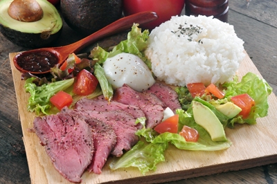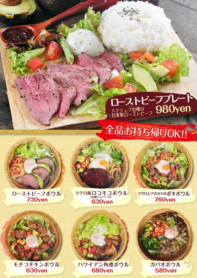 料理はハワイの定番フード ロコモコに加え、モチコチキン、ローストビーフ等が
