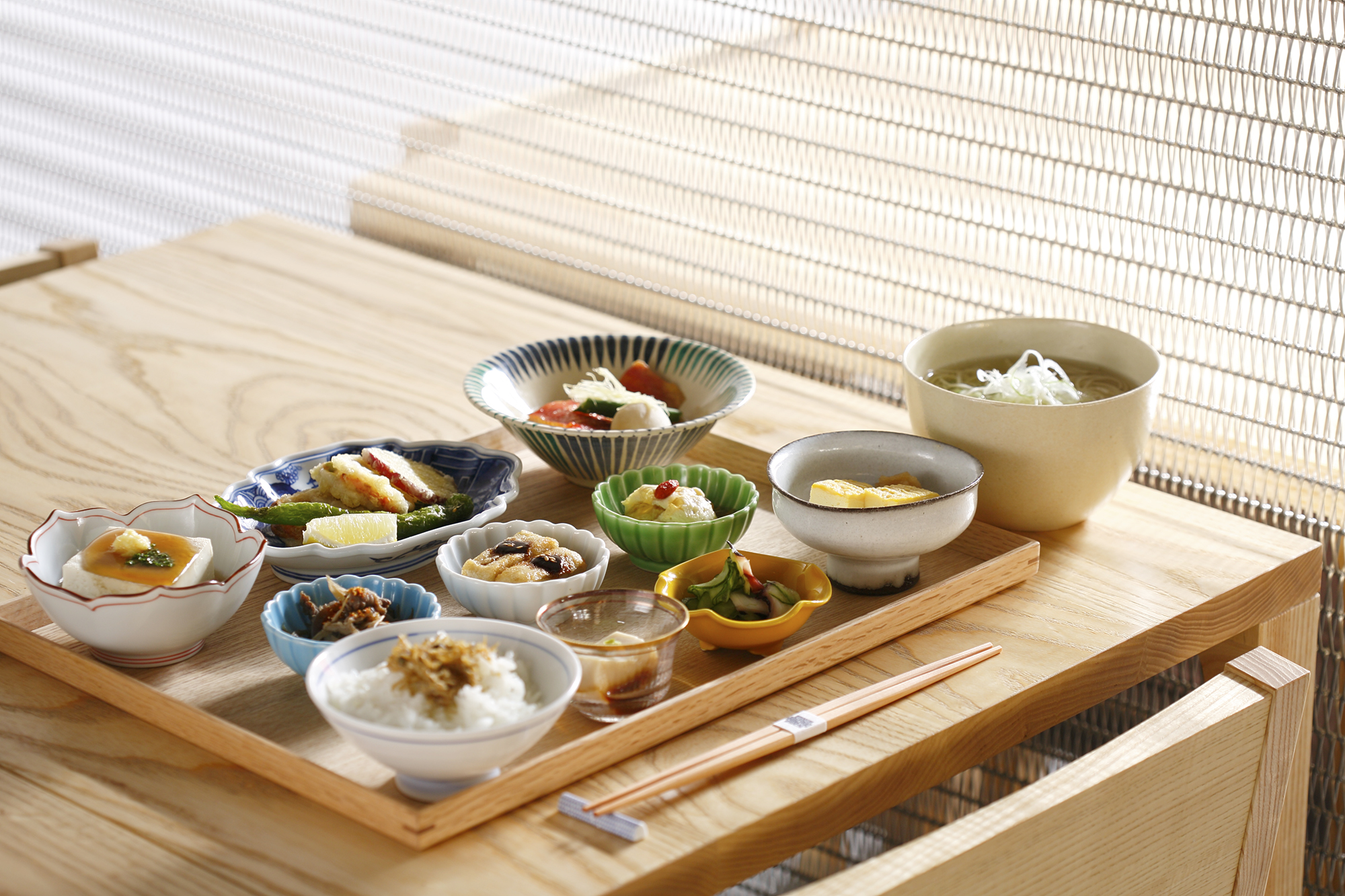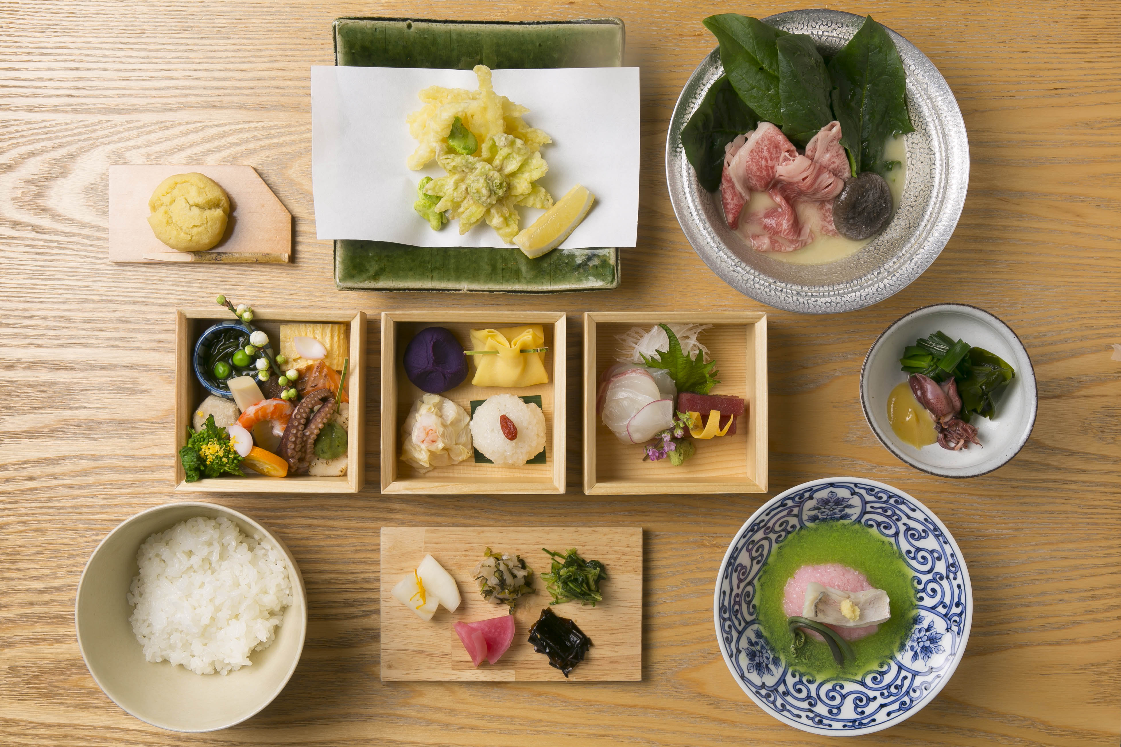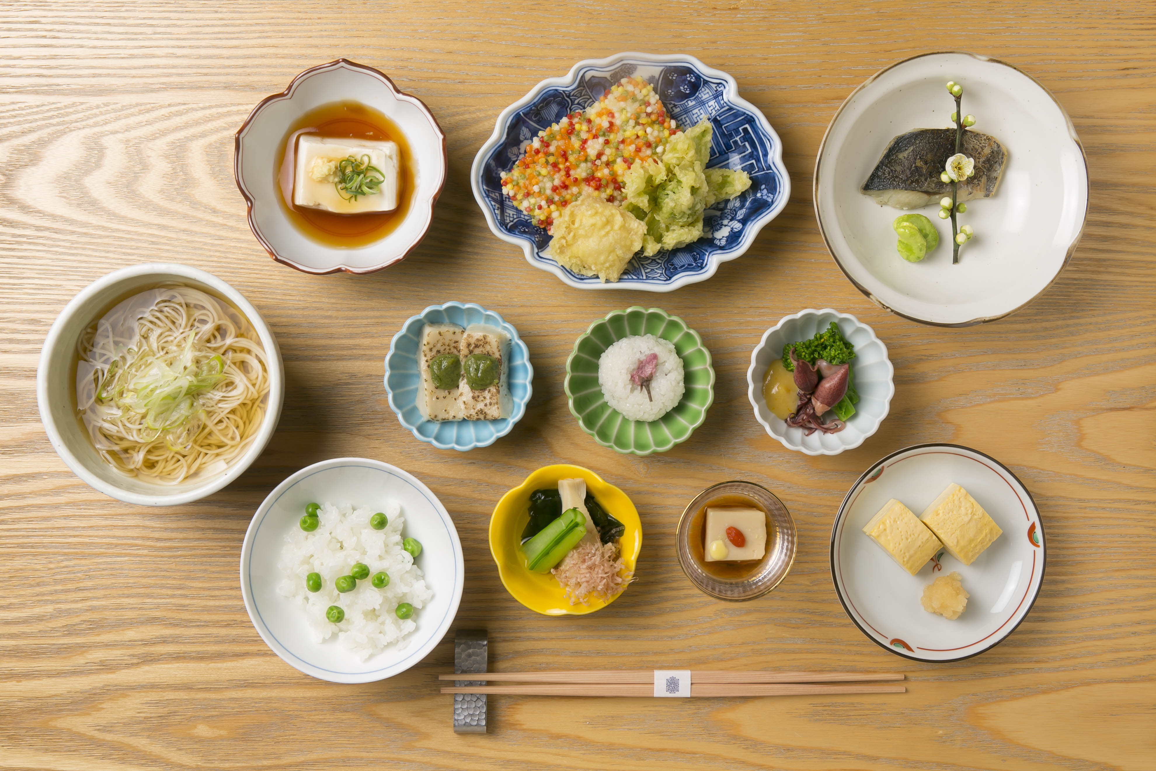 「九種のおばんざい御膳」は、蛍烏賊や桜餅、蕗のとう、菜の花など8種類の春の食材をふんだんに入れ込み、生八つ橋の天ぷらや、そばそうめんなどで居様ならではのメニューも盛り込みました。