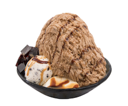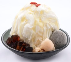 杏仁の独特な香りとほんのり甘い味わいを詰め込んだ、クセになるフレーバーアイスブロックを削り、ライチ、黒ごまアイス、ブラウンシュガーゼリーを添え、上から練乳をかけた、日本限定メニュー。