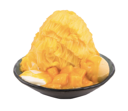 濃厚なマンゴーアイスブロックを削り、マンゴーシャーベットとパンナコッタ、マンゴーの果実にマンゴーソースをからめてトッピングした、本国台湾でも定番のメニュー。