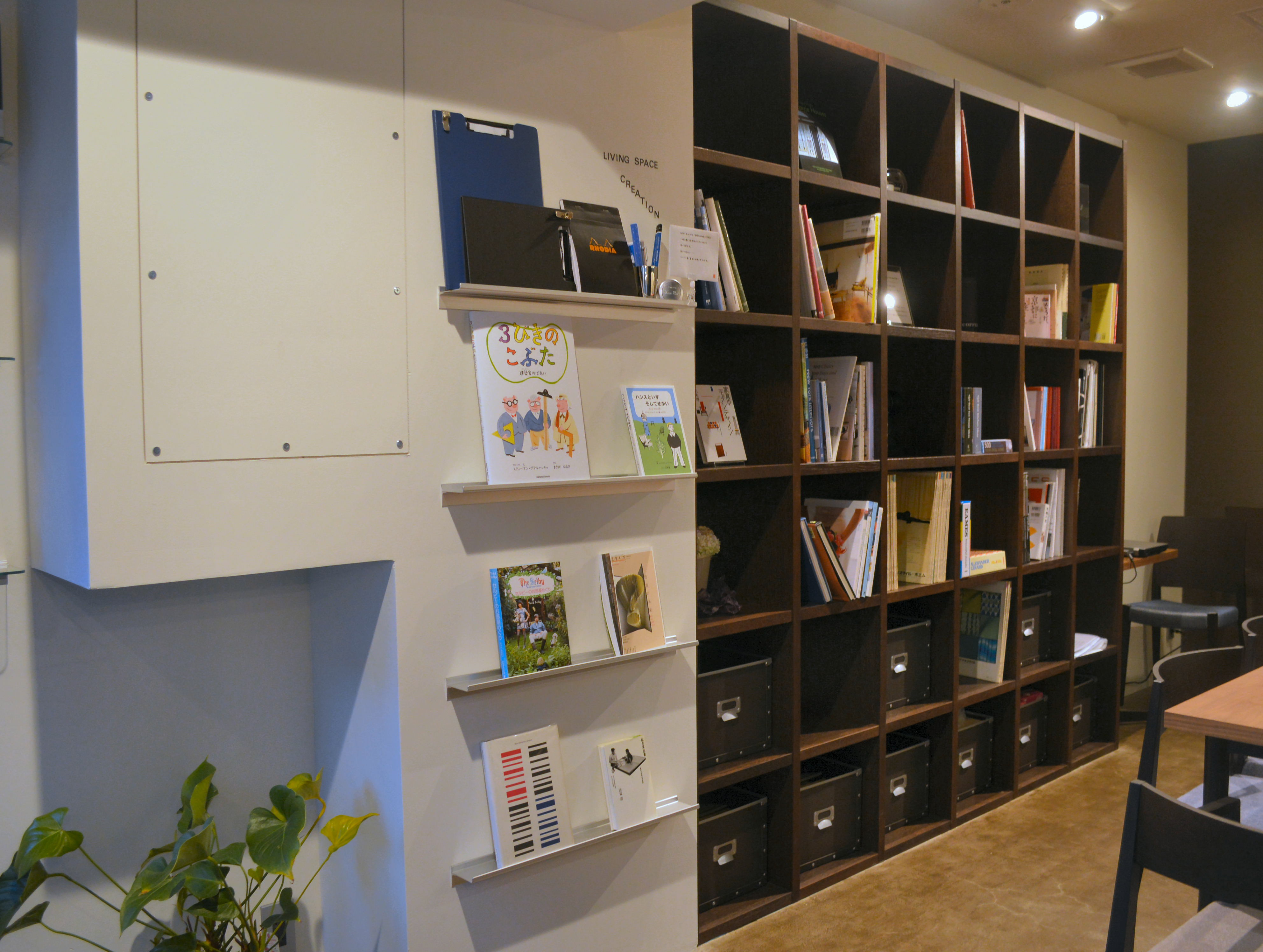 月に1度、誠光社の堀部篤史さんに建築関係や、リフォーム関係などの住まいに関する本をセレクトして頂き、本棚に並べております。長居大歓迎のため、インテリアにご興味のある方に大変ご好評いただいております。じっくり読むのも、パラパラとめくるだけでも楽しんで頂けるかと思います。