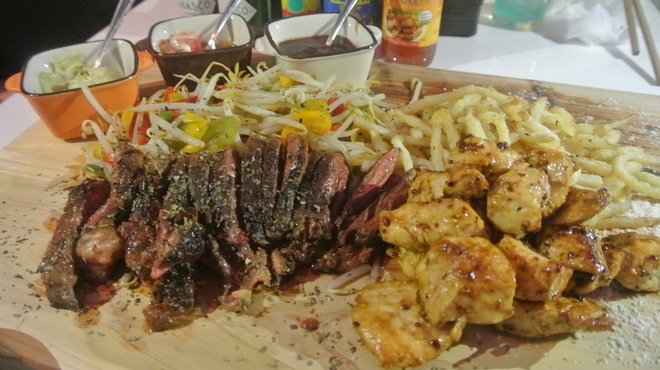 焼きたてのトルティーヤの上にハラミステーキ、鶏肉のマスタード和え、炒め野菜、フライドポテト等のお好みの具材を乗せ、アボガドソース、サルサソース、特製赤ワインソースの3種類のソースを付けていただき巻いてガブリつく料理です。ピリ辛好きの方にはタバスコ。激辛好きにはデスソースをご用意しています。すべてのお客様から大変好評いただいています。