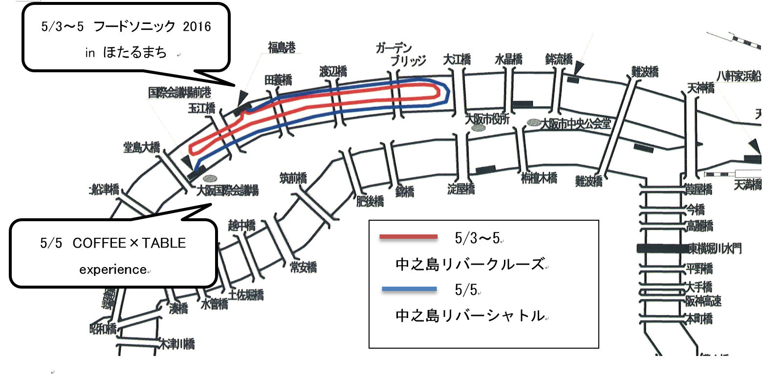 大阪市内で遊覧船を運航する舟運事業者から成る大阪シティクルーズ推進協議会(事務局:大阪市中央区大阪城2番地先、会長:久ノ坪宏司)は、2016年5月3日(火・祝)~5(木・祝)に、大阪・中之島西エリアの堂島川で「中之島リバークルーズ」と「中之島リバーシャトル」を運航することになりました。5月の心地よい陽気の中、大阪市内都心部を気軽にお楽しみいただける20分のコースとなっております。船着場に隣接するエリアでの飲食イベントと連携しており、“水の都”“食の都”大阪を満喫していただけます。また、小学生以下のお子様のご乗船料金は、おとな1名様につき1名様が無料となり、ご家族やご友人ともお誘いあわせいただきやすいGWらしい企画となっております。