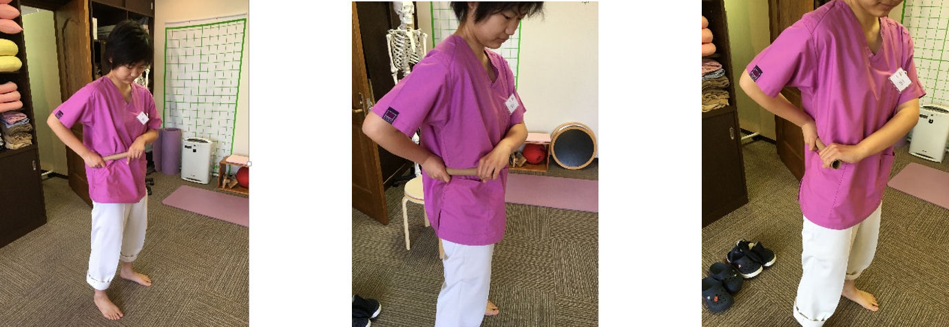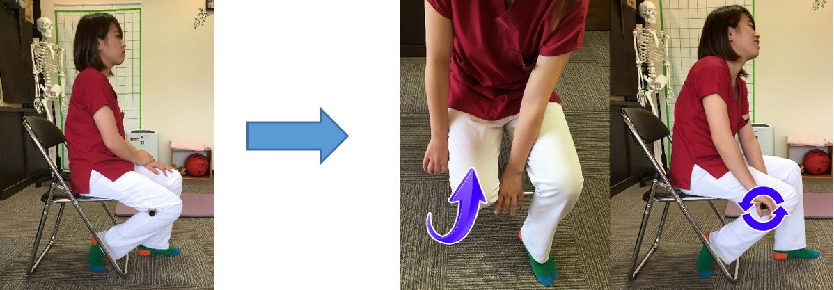 芯の両端を持って、自転車のペダルを漕ぐように20回す。反対の膝裏も同様に行う。