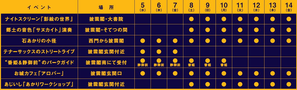 会場内に設置した「お城カフェ」では、来場者へのおもてなしとしてコーヒーとお菓子のセットをワンコイン500円で販売します。また「うどん県おいでまいキャラバン隊」の一員「さぬきの姫香姫(こうひめ)と静御前(しずかごぜん)」が玉藻公園を案内する催しや、庵治石を使用した「あかりワークショップ」ではキャンドルホルダー、記念品などの可愛い小物制作が楽しめます。
