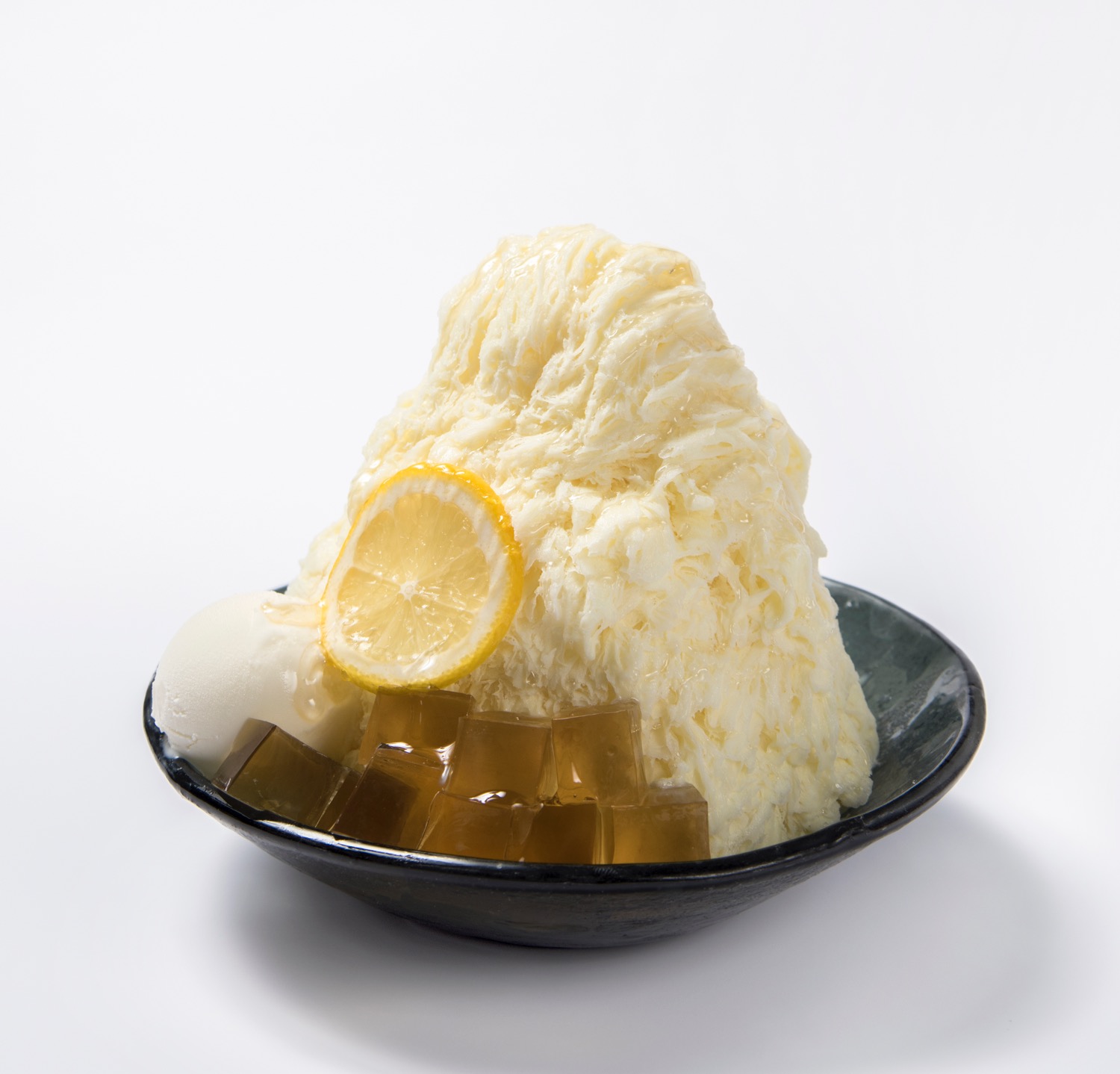 ハチミツとミルクのやさしい甘さのふわふわかき氷に、さっぱりとしたヨーグルトアイスと、フルーティーな香りのカモミールハーブゼリー、ハチミツ漬けしたレモンスライスを トッピングした、上品でスッキリとした新食感かき氷。