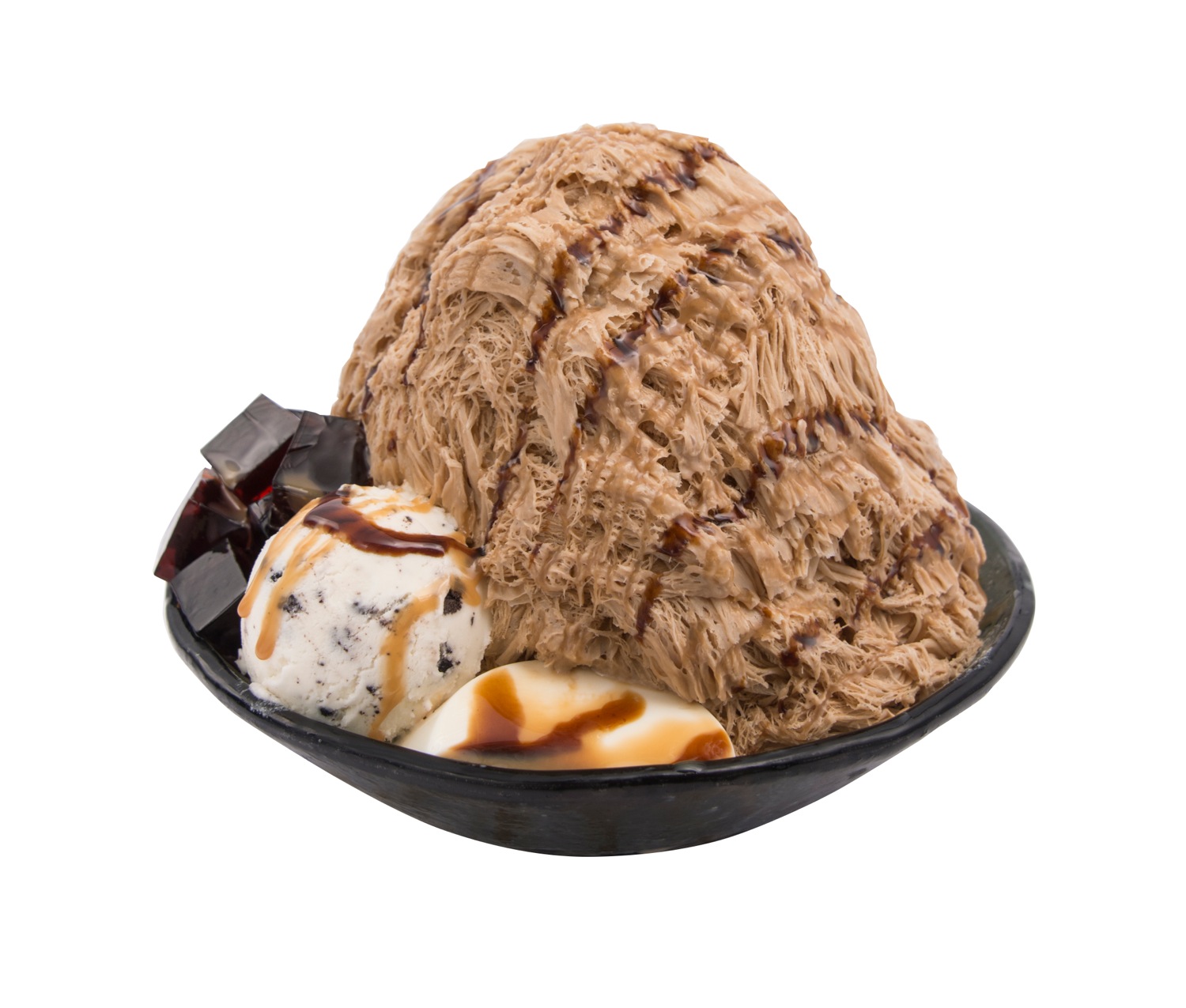 弾力のあるゼリー、パンナコッタとクッキークリームアイスをトッピング。ビターなコーヒーシロップをかけたメニュー。
