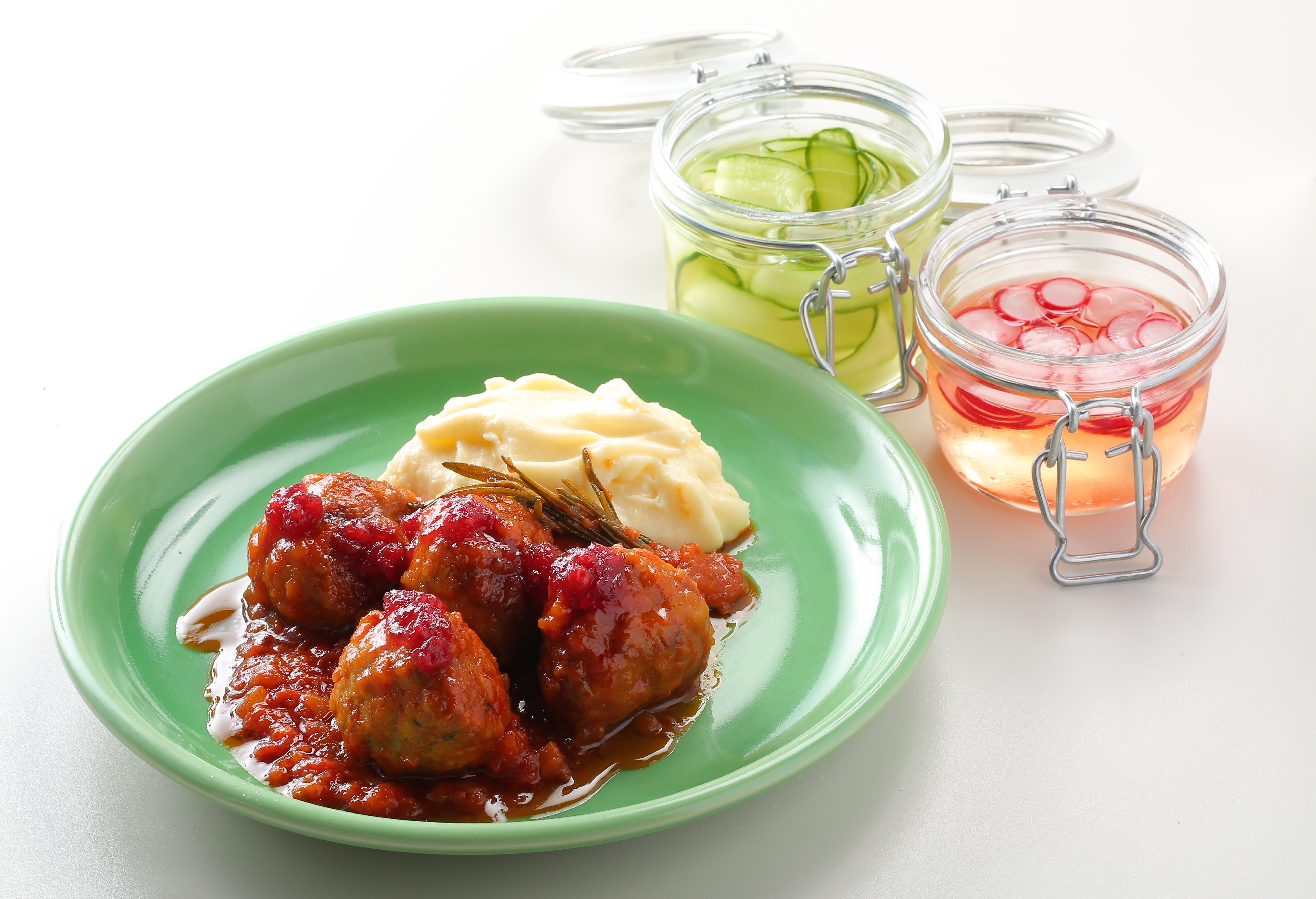 看板メニューとして人気No.1を誇る自慢の『ミートボール』も更に美味しくリニューアル。より肉感をしっかり残しジューシーに仕上げたミートボールに合わせ、トマトソースとクリームソースといった2種類のソースをご用意。付け合わせには、マッシュポテト・ライトピクルス・リンゴンベリーを添えて。